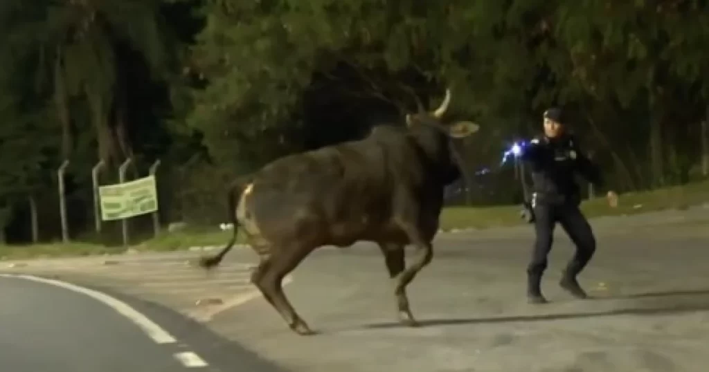 A imagem, registrada pela Globo Minas, mostra o boi caminhando pelo acostamento. O guarda se aproxima e dispara o taser para evitar que o animal fugisse. O boi investe contra o guarda, que corre. O animal cai, outro guarda dispara a arma de choque e, só então, o boi é capturado sem ferimentos e com segurança.