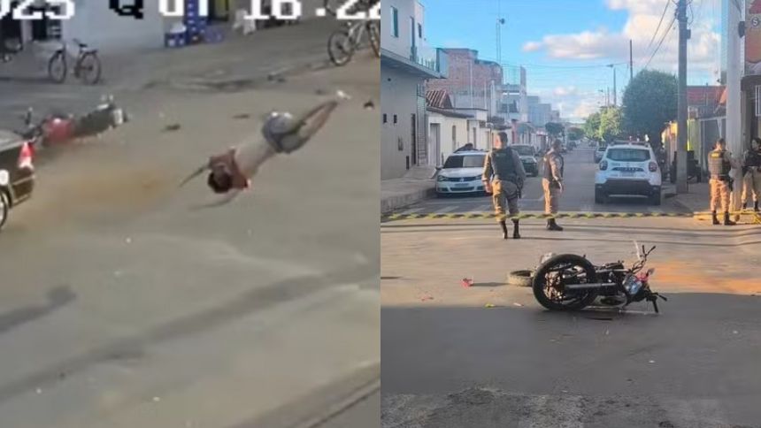 Um adolescente de 16 anos sofreu um grave acidente após perseguição policial em Taiobeiras, no Norte de Minas, nesta quinta-feira (19). Câmeras de segurança registraram o momento em que a moto em alta velocidade colidiu com um carro no cruzamento das ruas Caiçara e Belo Horizonte, no Centro da cidade, arremessando o condutor a cinco metros de distância.
