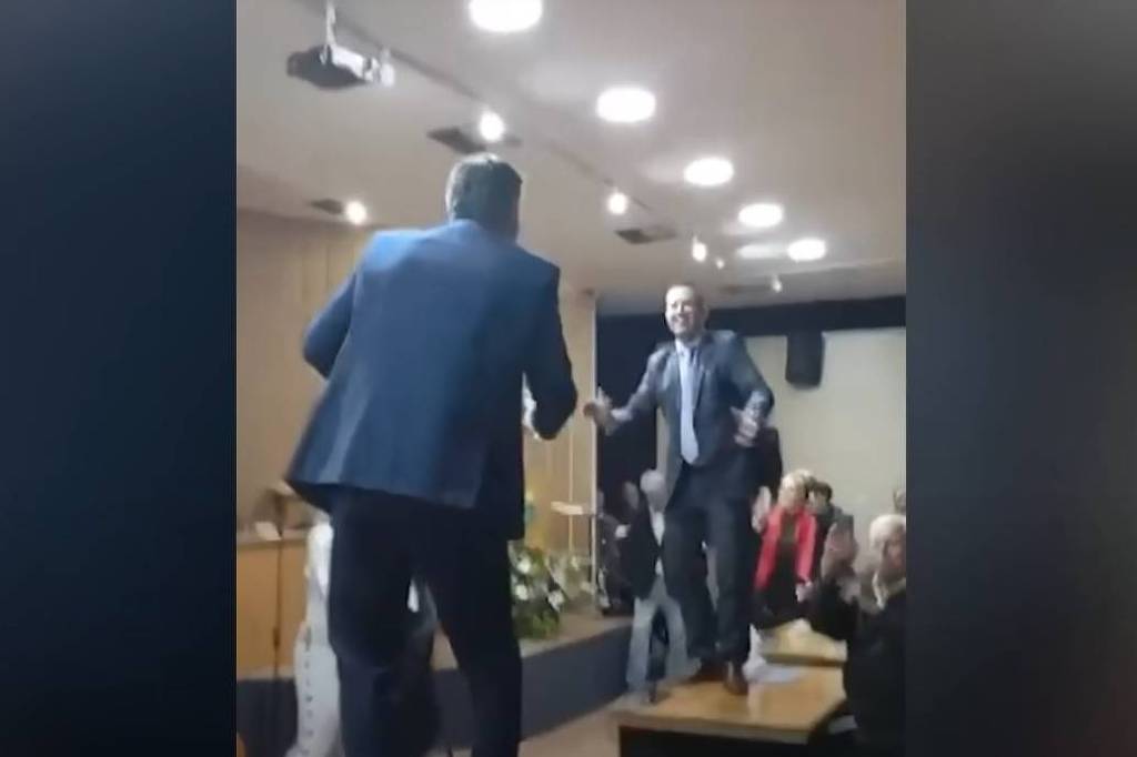 Caio Salgado (PL) e Professor Ródnei (PSD) subiram nas mesas durante a apresentação do cantor Elvis Andriolo, cover de Elvis Presley, contratado para a parte festiva da homenagem aos idosos. Eles dançaram ao som da música “Suspicious Minds”.