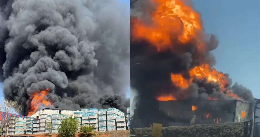 incêndio de grandes proporções em uma fábrica de isopor e plásticos