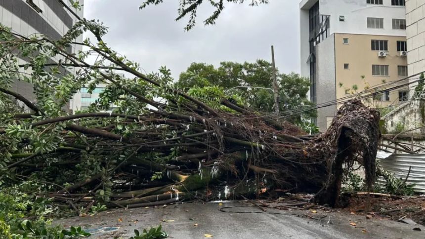 Uma árvore de grande porte caiu e interditou totalmente um quarteirão da Rua dos Aimorés, no trecho entre a rua Juiz de Fora e a avenida Barbacena, no bairro Barro Preto, Região Centro-Sul de Belo Horizonte, na manhã desta quinta-feira (26). O acidente foi causado pelas fortes chuvas que atingiram a capital mineira. Moradores relataram que um forte estrondo durante a madrugada, semelhante à explosão de um transformador, acordou a vizinhança.