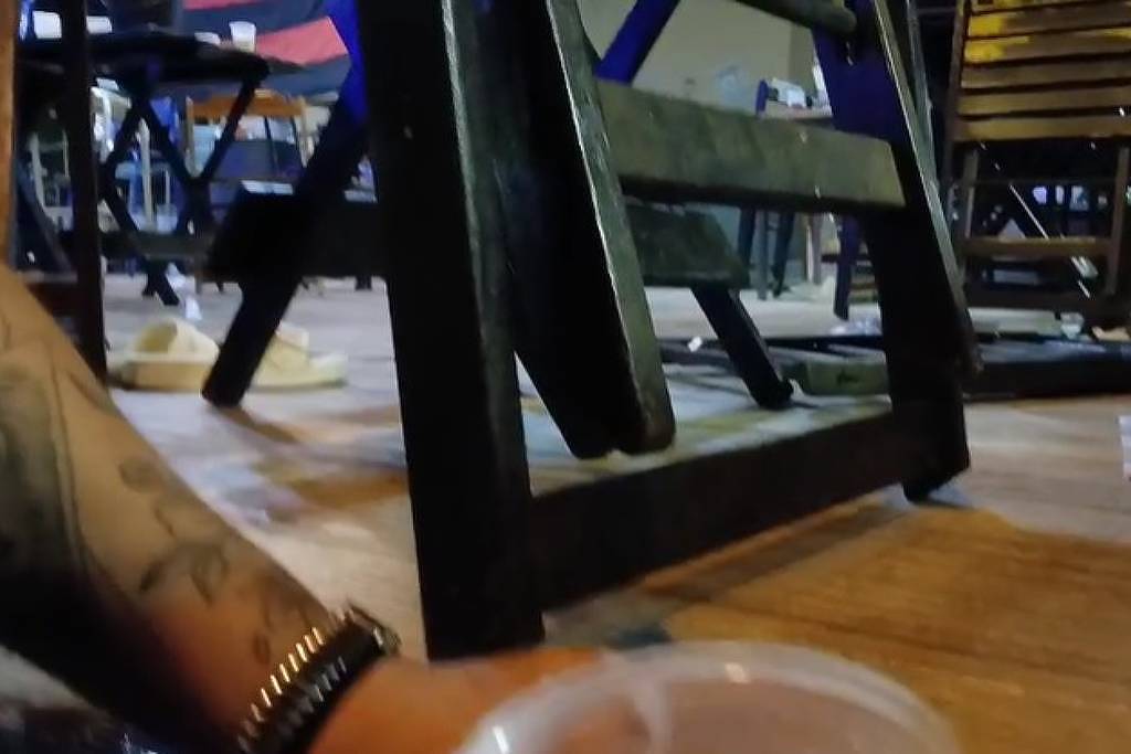 Vídeo que circula nas resde sociais mostra uma mulher abaixada no chão do bar, escondida entre mesas e cadeiras, enquanto orienta outras pessoas a se protegerem, no momento em que tiros são ouvidos do lado de fora do estabelecimento.