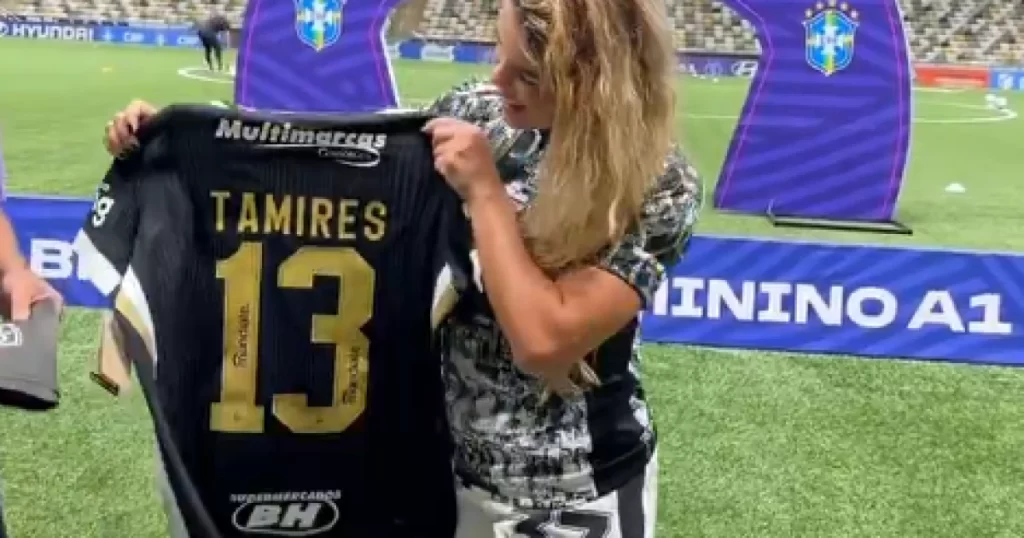 A lateral-esquerda das Brabas recebeu uma camisa do Atlético com seu nome gravado nas costas. O responsável por entregar o uniforme para a atleta foi Ricardo Guedes, gestor do time feminino do Galo.