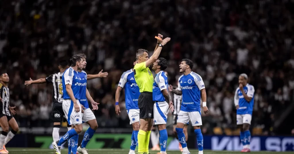 Logo depois do gol de empate do Atlético na Arena MRV, marcado por Ruan Tressoldi, Kaio Jorge foi expulso por fazer um gesto de ‘roubo’ em direção ao árbitro Paulo Zanovelli. Com auxílio do VAR, o dono do apito aplicou o cartão vermelho para o centroavante celeste.