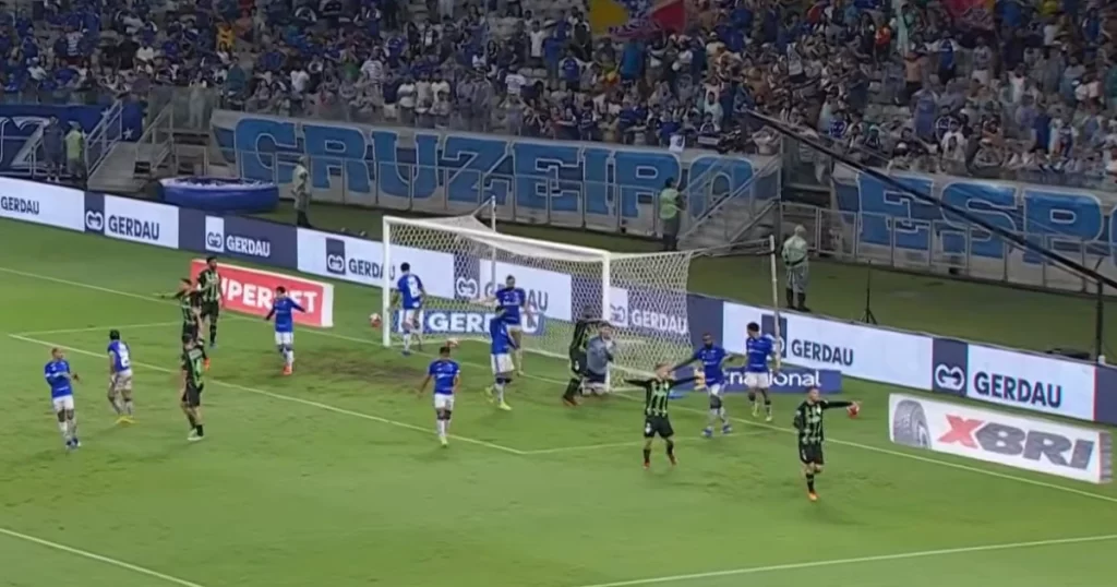 Após uma breve indefinição sobre o lance, a arbitragem assinalou o escanteio para o Coelho. Naquele momento, o placar tinha 2 a 0 para o Cruzeiro no clássico pela sétima e rodada da fase classificatória do Estadual.