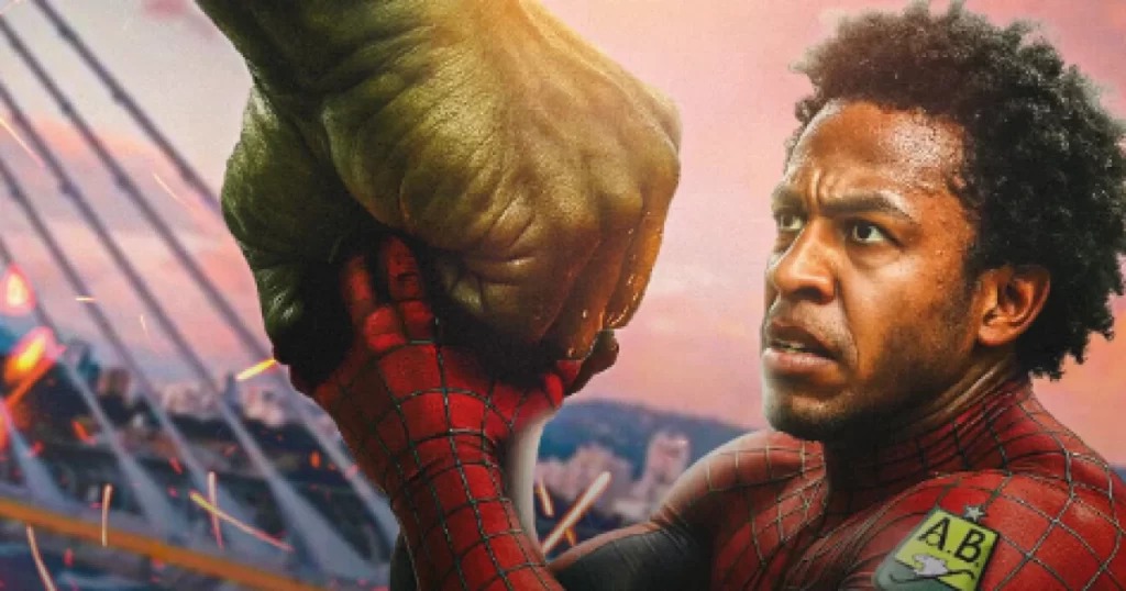 Na imagem, o jogador Kevin Londoño, do Bucaramanga, aparece vestido com o uniforme do Homem-Aranha, segurando um soco de Hulk.