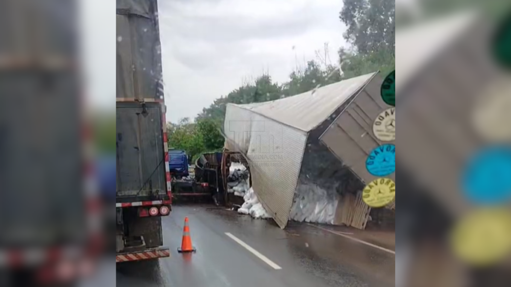 A ocorrência foi registrada na altura do km 460, na região da Gineta, logo após uma forte chuva atingir a área. De acordo com informações, dois caminhões perderam o controle da direção. Um deles acabou parando na vala central da rodovia, enquanto o outro capotou na pista.