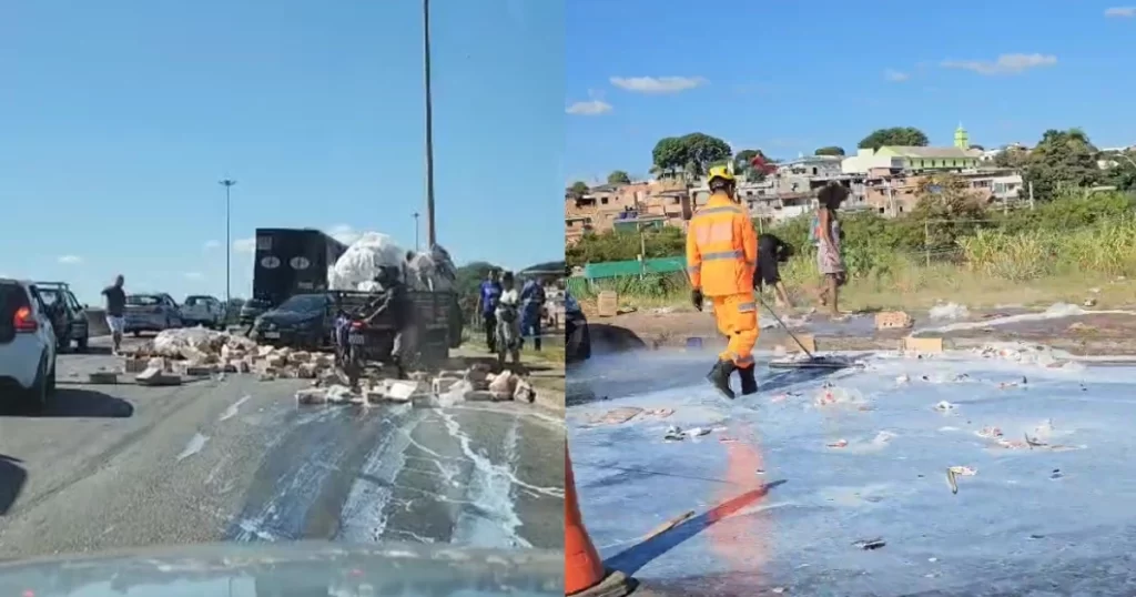 Conforme registrado pela Polícia Militar de Minas Gerais (PMMG), o caminhoneiro autorizou a população a levar a carga que ele transportava, que havia caído na pista.