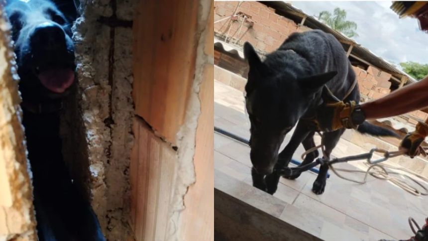 A ocorrência foi na rua São Geraldo, no bairro Palmeiras. De acordo com os bombeiros, o animal aparentava cansaço após passar várias horas no local. Para retirá-lo, a equipe precisou romper um dos lados de uma parede e acessar o ponto onde o cachorro estava preso.