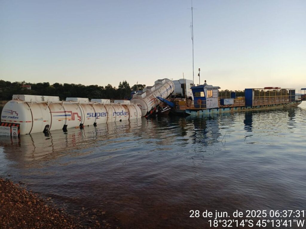 Em Morada Nova de Minas/MG, veículo bitrem da transportadora SUPER RODAS, carregado com 35 mil litros de etanol, ao desembarcar da balsa do Porto Novo ( BR 040 –>Morada Nova de Minas), acidentou. Parte do veículo está no interior da balsa, e parte submersa represa. Aparentemente não há vazamento de combustível/óleo.