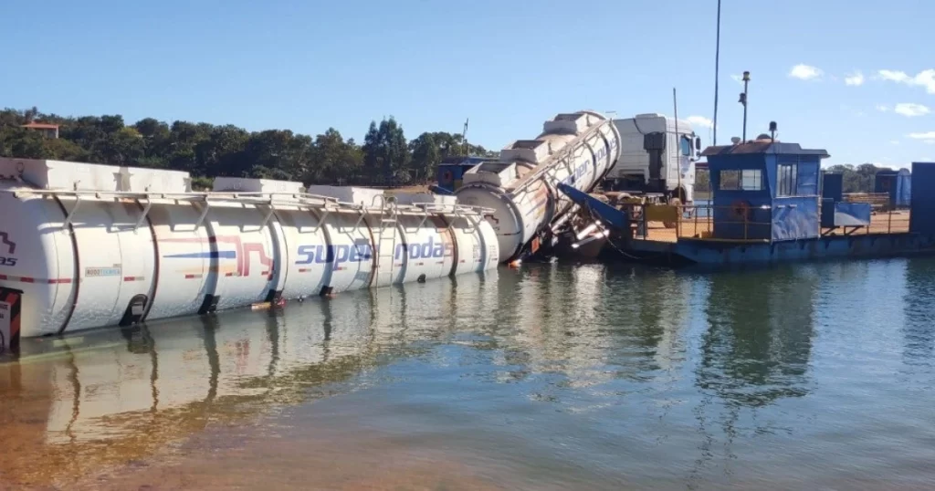 Carreta transportando líquido inflamável teve uma de suas composições parcialmente submersa, na noite de sexta-feira (27), durante a manobra de embarque em uma balsa na Represa de Três Marias, em