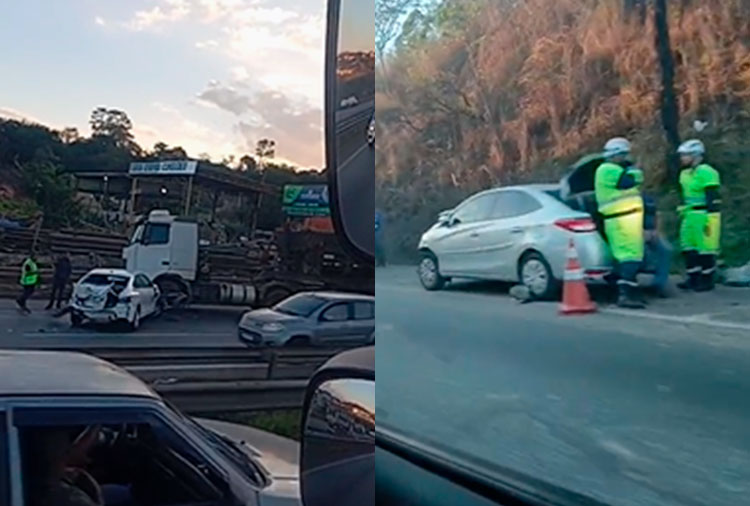 No sentido Belo Horizonte, uma colisão envolvendo dois carros e um caminhão interditou a faixa da direita e o acostamento. O trânsito flui apenas pela faixa da esquerda, gerando um congestionamento de mais de 5 km.