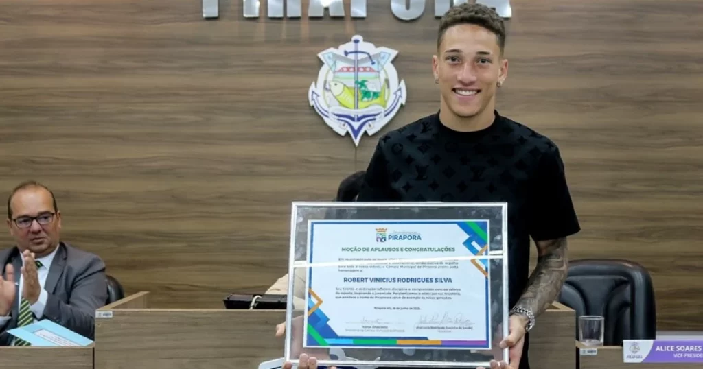 A Câmara do município do Norte de Minas concedeu ao atacante de 20 anos uma Moção de Aplausos, em reconhecimento a trajetória de superação, disciplina e talento. A homenagem foi proposta pela vereadora Lúcinha da Saúde e pelo presidente Itamar Alves Mota.