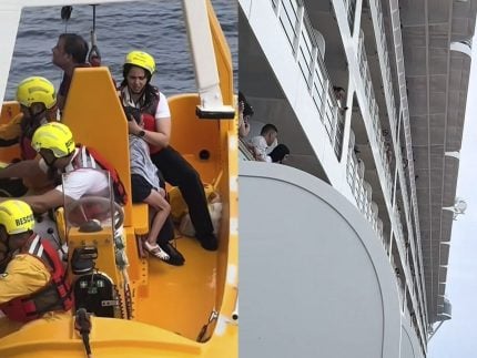 “Sr. MOB… bombordo”, disse o código para alertar “homem ao mar”, pouco antes da operação de resgate começar. Minutos depois, um barco de resgate foi colocado no mar e acelerou em direção aos dois, que foram resgatados, e a criança pareceu ter ficado abalada.