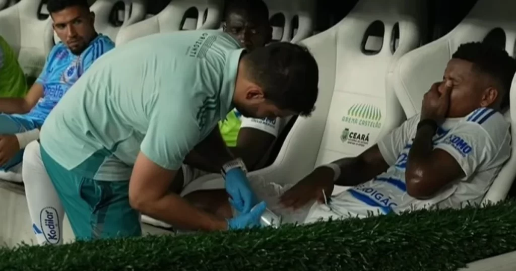 Poucos minutos depois, a transmissão da partida mostrou um membro do departamento médico do Cruzeiro aplicando tratamento de gelo no adutor da coxa direita de Arroyo.
