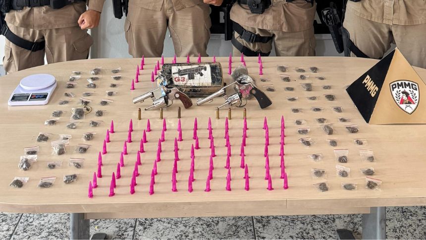 Após a prisão, os militares realizaram diligências na casa dos suspeitos e encontraram mais um revólver calibre 38, 70 buchas e uma barra de skunk, 110 pinos de cocaína e uma balança de precisão.