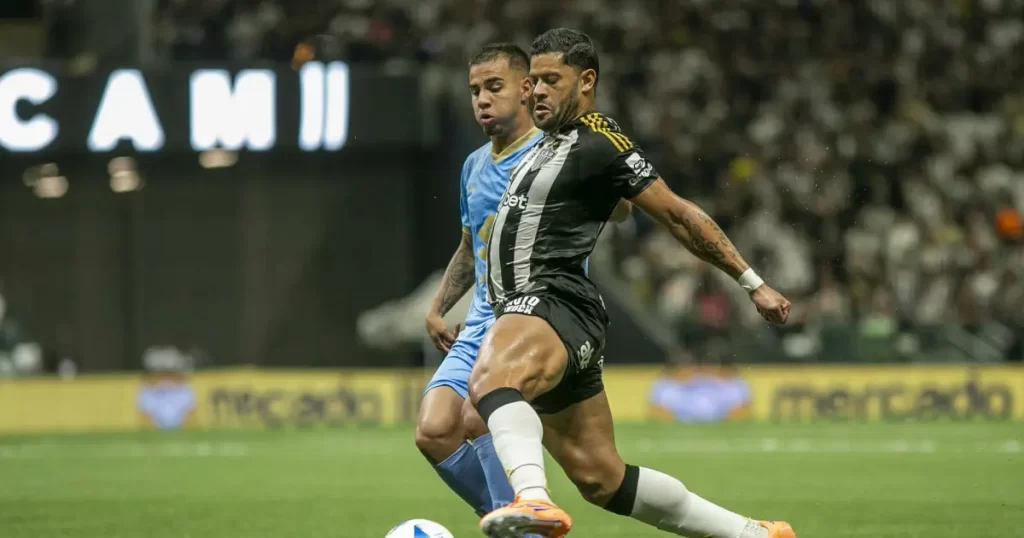 Hulk, atacante do Atlético, reclamou de um possível pênalti durante a partida contra o Bolívar-BOL, nesta quarta-feira (24), pelas quartas de final da Copa Sul-Americana, na Arena MRV.