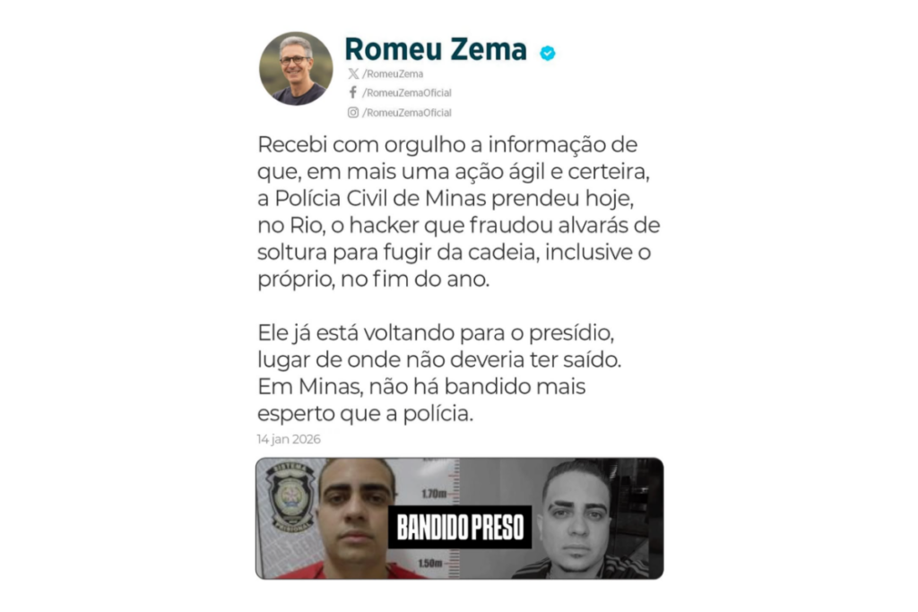 Na publicação, Romeu Zema elogiou a atuação da Polícia Civil, classificando a ação como ágil e certeira, e afirmou que o criminoso já está sendo reconduzido ao sistema prisional, de onde não deveria ter saído. O governador reforçou ainda a confiança no trabalho das forças de segurança mineiras.