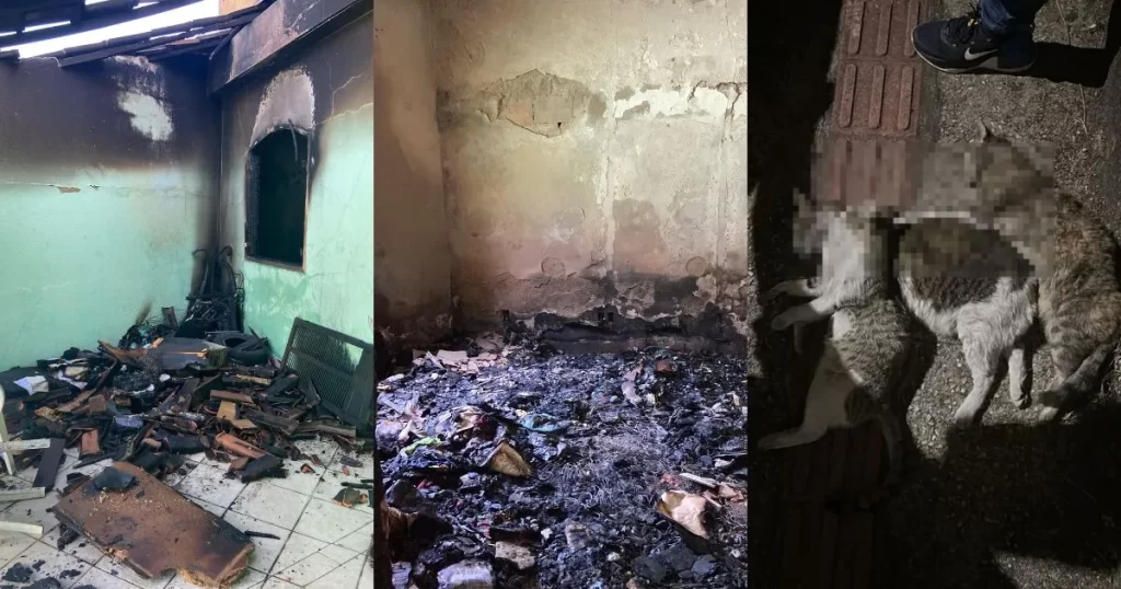 “Estava muito quente e veio aquela fumaça quente em mim. Eu abri a porta para meu cachorro conseguir fugir, mas meus gatos morreram. O meu gato Téo, a Lindinha e a Pequenininha que só tinha 5 meses. O Téo era meu amigo e ele tirou ele de mim”