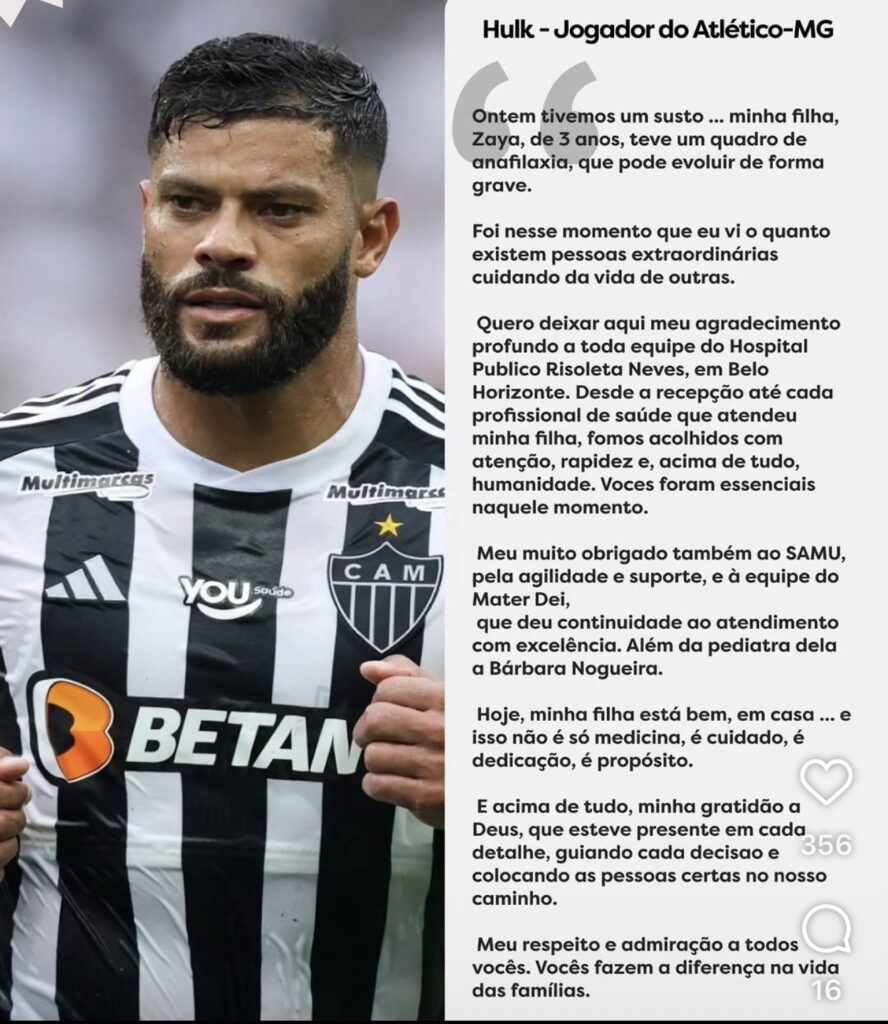 O atacante Hulk compartilhou um relato de agradecimento após a filha, de 3 anos, passar por um quadro de anafilaxia em Belo Horizonte. A situação exigiu atendimento médico de urgência e mobilizou diferentes equipes de saúde.