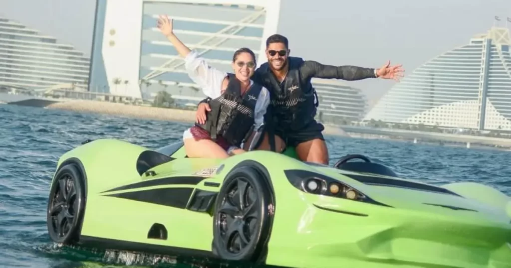O Jet Car é uma espécie de lancha em formato de carro esportivo e o seu aluguel custa 133 euros (R$ 840) a hora na plataforma Get Your Guide, de Dubai.