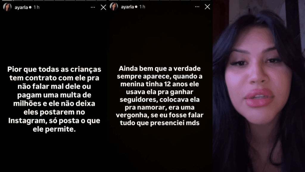 Nos últimos dias, Ayarla publicou uma sequência de stories no Instagram detalhando situações que, segundo ela, envolviam o controle da imagem de crianças e adolescentes, contratos restritivos e até a sexualização de menores. “Quando a menina tinha 12 anos, ele usava ela para ganhar seguidores, colocava ela para namorar, era uma vergonha. Se eu fosse falar tudo que presenciei ”, escreveu em uma das postagens.