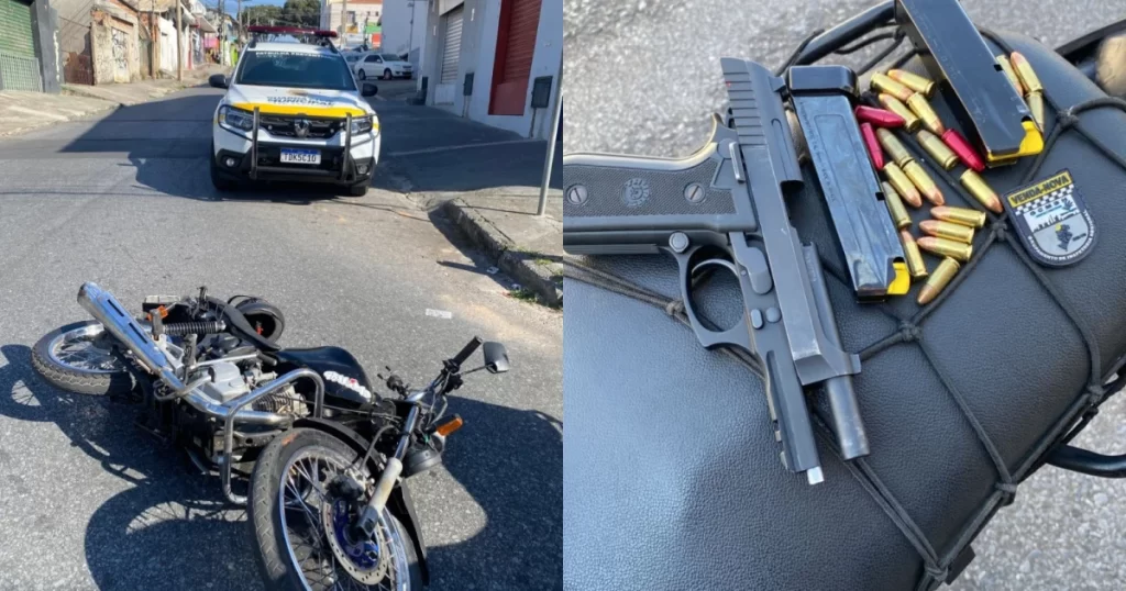 Um jovem, de 19 anos, foi preso nesse sábado (16), depois de empinar uma moto e ser flagrado com uma pistola calibre 9 mm. O suspeito foi abordado pela Guarda Civil Municipal na região da Venda Nova, em Belo Horizonte, fugiu e foi perseguido. Depois de passar por algumas ruas, tentando evitar a viatura, o homem perdeu o controle da moto e caiu na Rua dos Camargos, no bairro Maria Helena, já em Ribeirão das Neves.