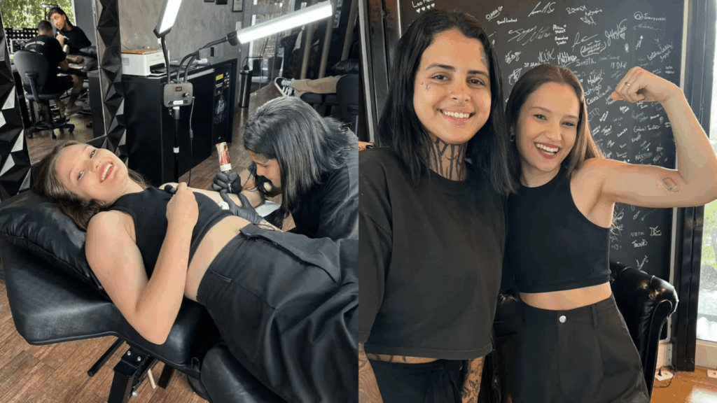 Karize escolheu eternizar na pele duas referências afetivas. A primeira foi a data de nascimento da avó, uma homenagem íntima que, segundo a atriz, deve emocionar a família. Já a segunda tatuagem representa sua paixão pelo esporte, que sempre fez parte da trajetória pessoal e profissional dela. O processo aconteceu no Studio Zero Um, com a tatuadora Carol, especialista em fine line, técnica conhecida pelos traços delicados e detalhados.