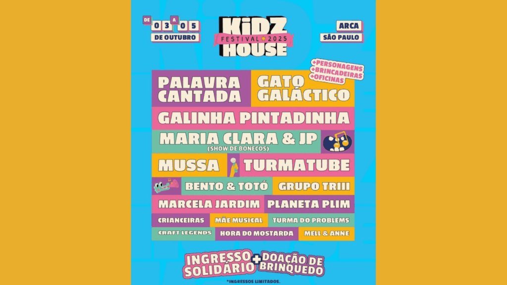 O maior festival infantil do Brasil chega à capital paulista com novidades e espírito de solidariedade. Depois de reunir mais de 15 mil pessoas em sua estreia, o Kidzhouse Festival — conhecido como o “Rock in Rio das crianças” — volta a São Paulo nos dias 3, 4 e 5 de outubro de 2025, na ARCA.