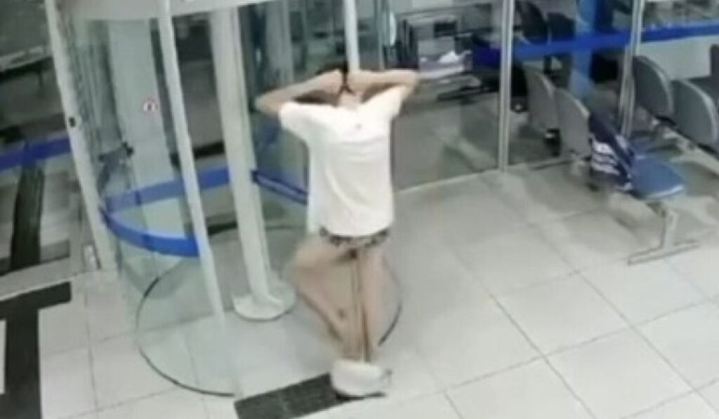 Nas imagens, é possível ver o jovem quebrando caixas eletrônicos na tentativa de pegar dinheiro, mas sem levar nada. Ao tentar acessar outra área da agência, ele ficou com o pescoço preso na porta giratória de segurança. Em meio às tentativas frustradas de se soltar, chegou a tirar a bermuda para conseguir escapar.