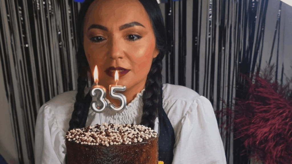 Com seu visual característico tranças, maquiagem marcante e um figurino clássico Maíza registrou o momento de apagar as velas enquanto refletia sobre a importância de celebrar a vida e os ciclos que se renovam.
