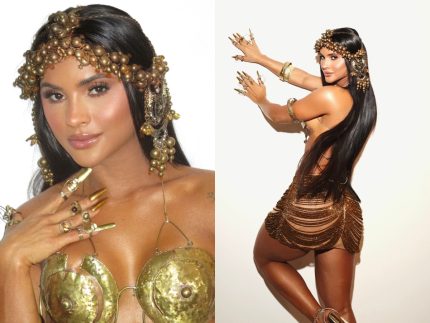 Entre os nomes mais comentados do Carnaval 2026, a rainha de bateria da Pura Cadência tem apostado em produções elaboradas. Em Salvador, ela escolheu um look dourado sob medida, com saia cravejada de cristais dourados e acessórios metálicos banhados a ouro.