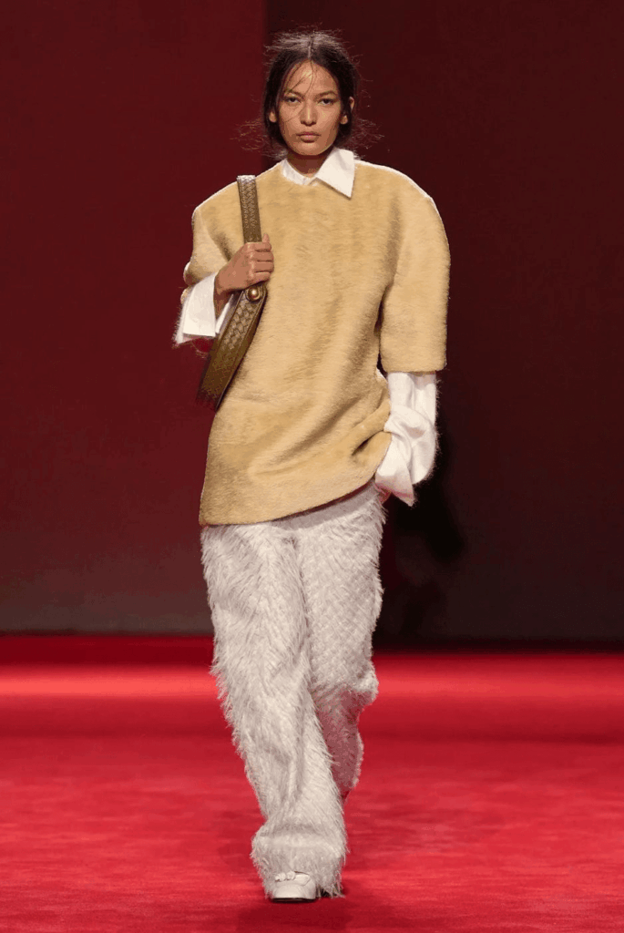 Em sua primeira coleção para a Bottega Veneta, Louise Trotter apresentou uma proposta que valoriza construção, acabamento e estrutura. Foi nesse contexto que Luana Guimarães cruzou a passarela com um look alinhado à narrativa da temporada. A produção apostou em silhueta ampla e minimalista, com túnica bege estruturada sobre camisa branca de colarinho marcado e punhos alongados. A calça de textura felpuda em tom claro criou contraste visual interessante, enquanto a bolsa carregada no ombro reforçou o acabamento artesanal que se tornou assinatura da grife italiana no circuito de luxo.