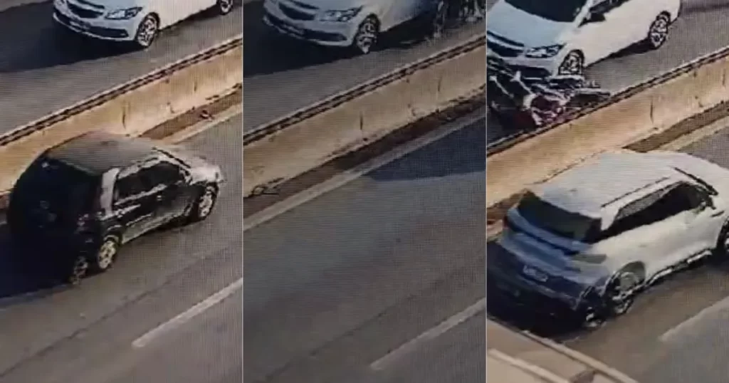 As imagens mostram o motorista do carro reduzindo a velocidade quando a moto tenta fazer uma ultrapassagem e atinge a lateral do veículo.