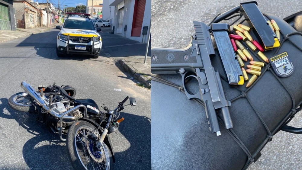 Um jovem de 19 anos foi preso neste sábado (16) após empinar uma motocicleta, portar uma pistola 9 mm e tentar fugir da Guarda Civil Municipal de BH. A ação começou na região de Venda Nova, e terminou após o homem cair do veículo na rua dos Camargos, bairro Maria Helena, na divisa com Ribeirão das Neves.