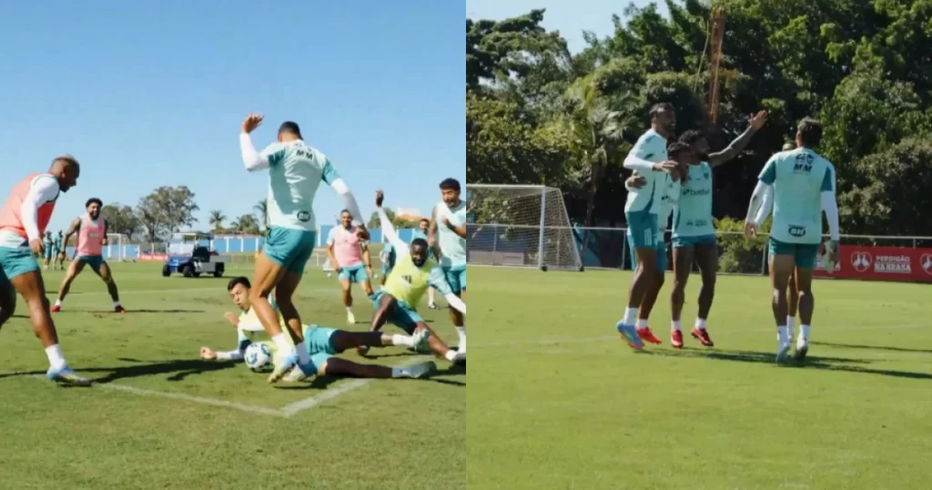 O primeiro deles foi no tradicional “bobinho”, que geralmente abre os treinos. Somente com um toque, os jogadores tocam a bola em um círculo, com outros dois na roda, até 21 passes para completar uma volta e ser necessário um corte adicional.
