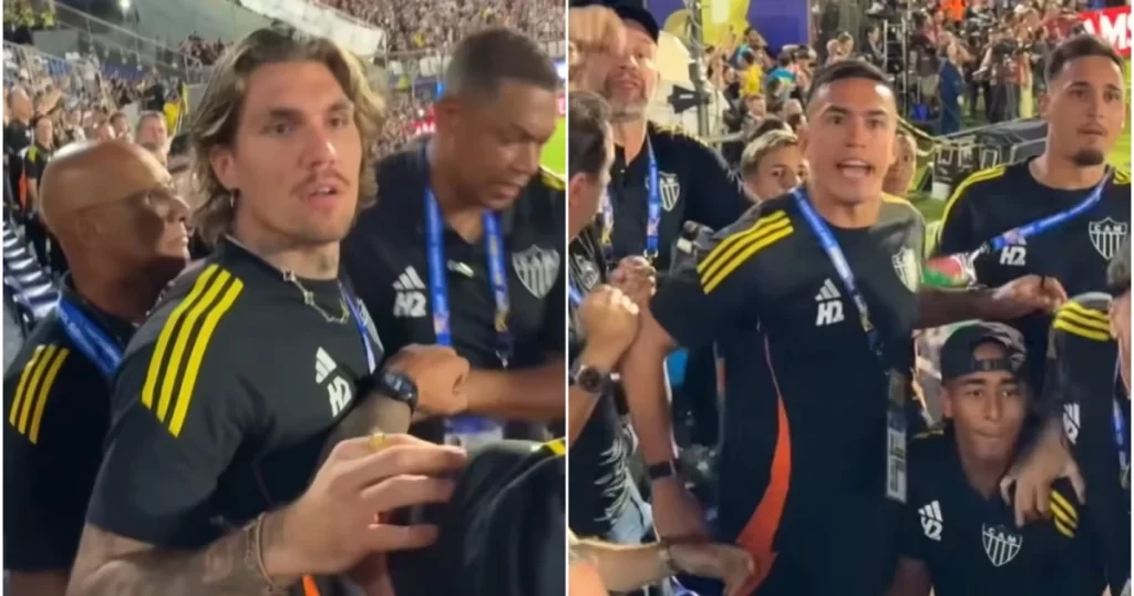 A delegação do Atlético estava no setor logo atrás do banco de reservas, no meio de diversos alvinegros, e ouviu as reclamações do torcedor. Estavam juntos o zagueiro Lyanco; os atacantes João Marcelo, Cuello e Mosquito; outros jovens da base do clube, seguranças e até mesmo Bruno Muzzi, CEO do clube.
