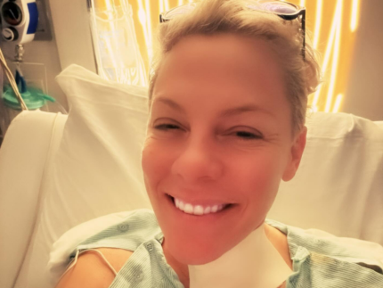 Pink sorrindo, com curativo no pescoço em uma cama de hospitalReprodução Instagram Pink