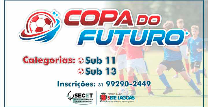 A Prefeitura de Sete Lagoas (PMSL), por meio da Secretaria Municipal de Cultura, Esportes e Turismo, anuncia o retorno de uma das competições esportivas mais tradicionais da cidade: a Copa do Futuro 2025. A competição vai movimentar diversos campos da cidade com jogos nas categorias Sub-11 e Sub-13, a partir do dia 9 de agosto.