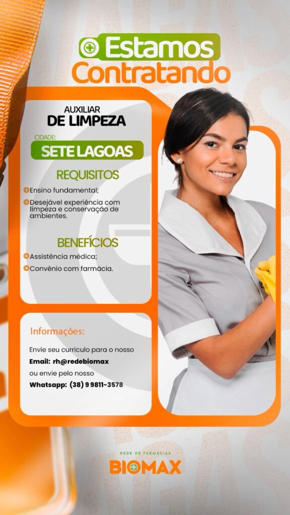 A Rede de Farmácias Biomax está com uma nova oportunidade de emprego aberta em Sete Lagoas. A empresa está contratando Auxiliar de Limpeza, com início imediato.