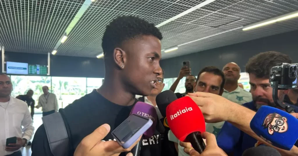 nesta quarta-feira (26). Reforço do clube para 2026, o jogador desembarcou no Aeroporto Internacional de Belo Horizonte, em Confins, e fez projeções para a próxima temporada.