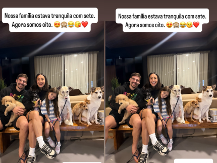 “Nossa família estava tranquila com sete. Agora somos oito”, brincou ela na imagem de todos reunidos na sala de casa: Bupi, Coco, Lucky, Belinha e Maui.
