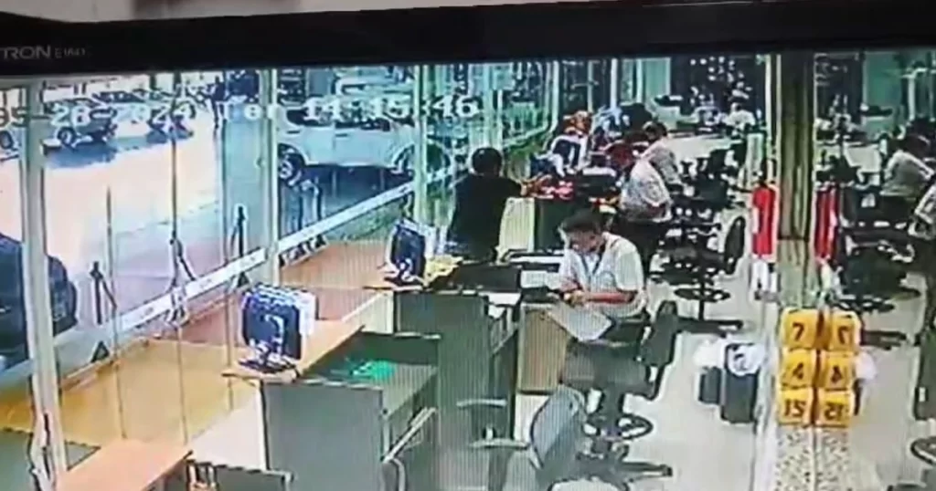O crime foi flagrado por imagens do circuito de segurança, que mostraram o momento em que a vítima anda de costas com uma pasta vermelha em mãos e vai até um dos guichês da concessionária. Em seguida, Marcelio, de camiseta preta, aparece entrando na loja com a arma em punho.