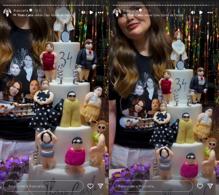 Thais Carla compartilhou nas redes sociais a emoção de ser surpreendida com a festa. “Cheguei e aqui, do nada, festa surpresa. Com blusinha e tudo. Olha meu bolo. Chocada!”, escreveu, demonstrando seu entusiasmo. O ponto alto da festa foi um bolo temático, adornado com diversas representações da aniversariante, cada uma simbolizando diferentes fases de sua trajetória pessoal e profissional.