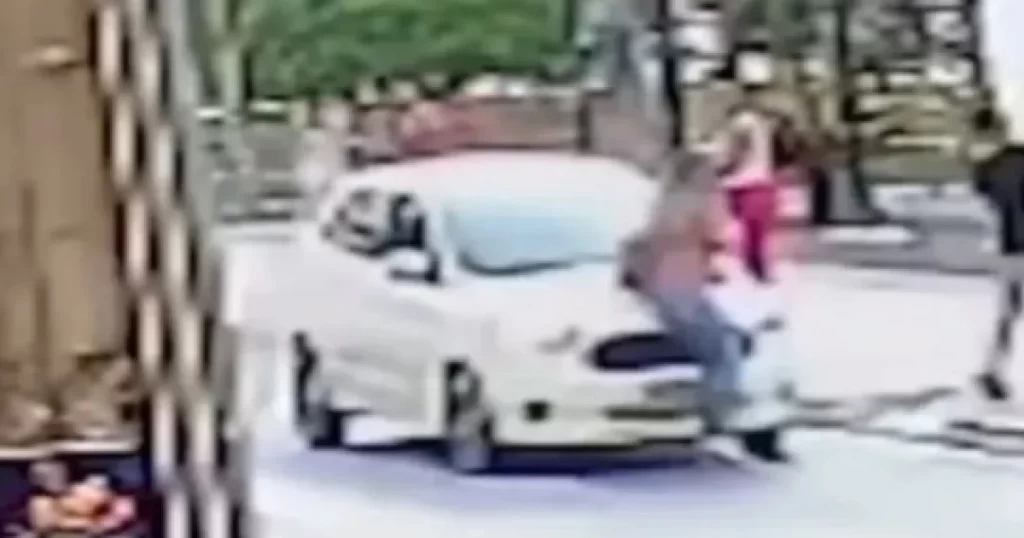 Nas imagens é possível ver duas pessoas atravessando a rua correndo. Uma delas consegue chegar até o outro lado, mas a outra mulher acaba sendo atingida atingida e arremessada pelo carro, que não conseguiu parar a tempo.