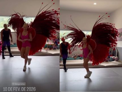 Imagens mostram a influenciadora treinando com as asas da fantasia dias antes do desfile pela Grande Rio