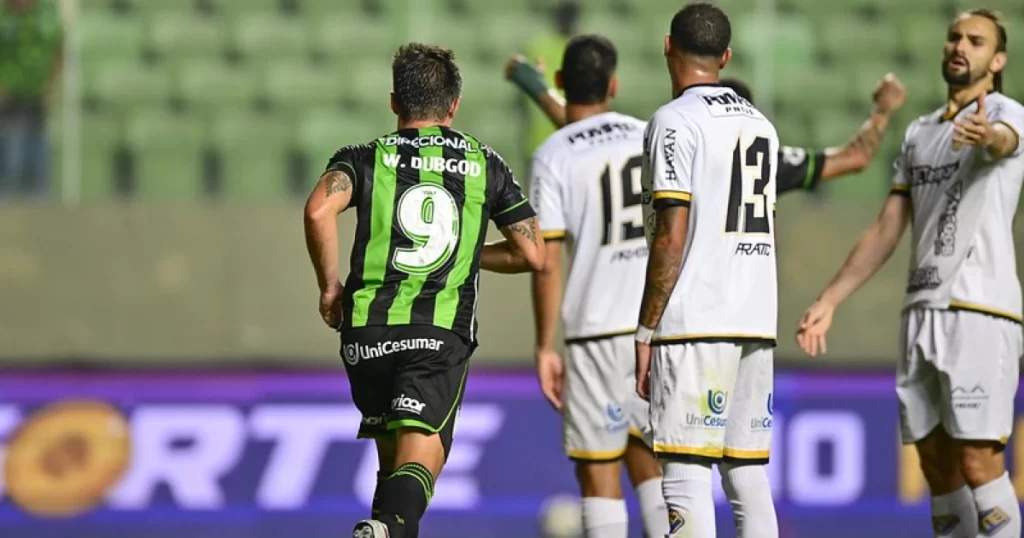 Diferente da maior parte do primeiro tempo, dessa vez o América acelerou. Júlio apareceu em ótimas condições pelo lado direito e lançou para a área. A bola passou por todo mundo e chegou em Willian Dubgod, que mostrou oportunismo e, de perna esquerda, abriu o placar para o Coelho.